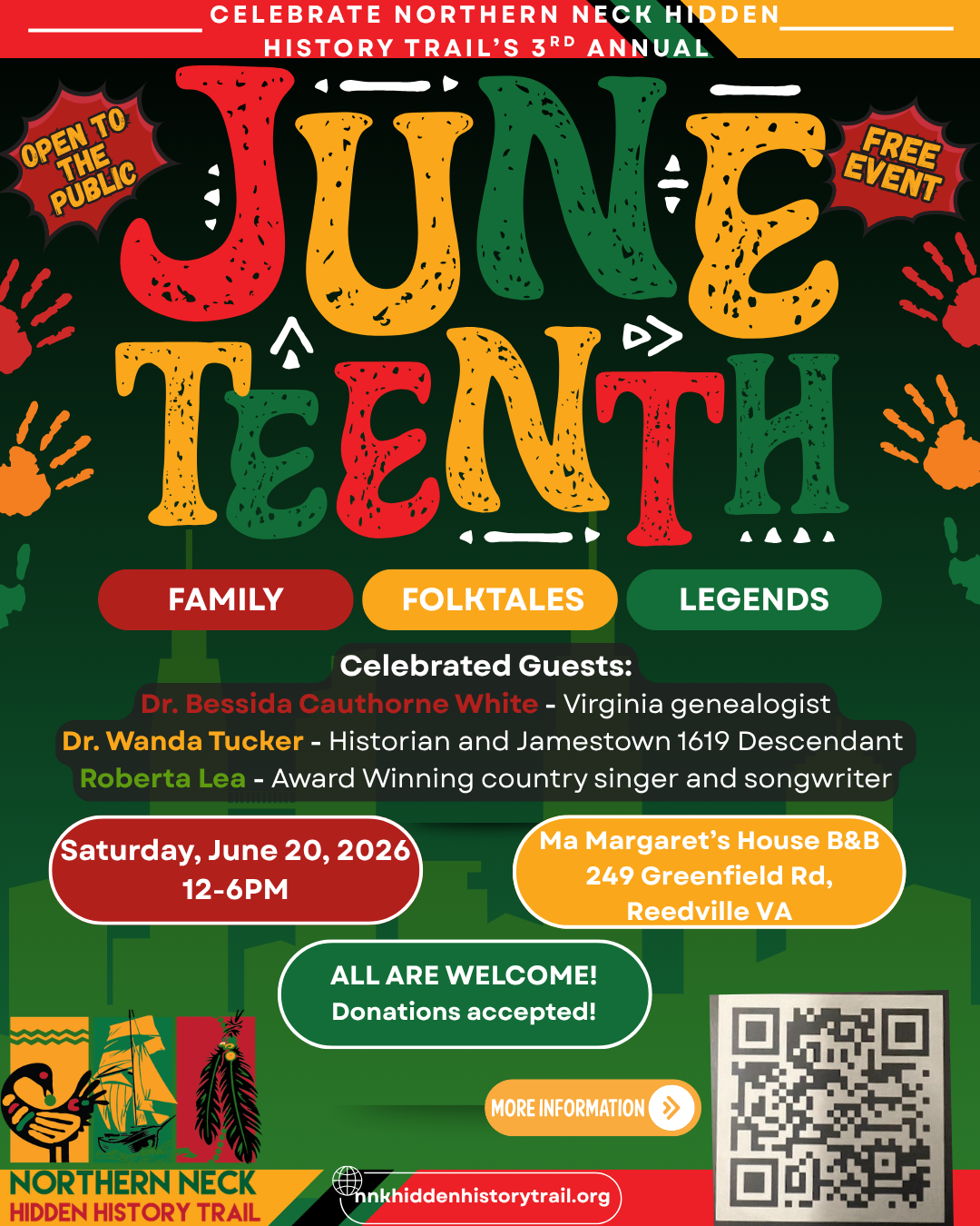 SAVE THE DATE! Please join us at Ma Margaret’s House B&B, 249 Greenfield Road, Reedville, VA from 12 PM to 6 PM celebrating NNK Family Folktales and Legends!